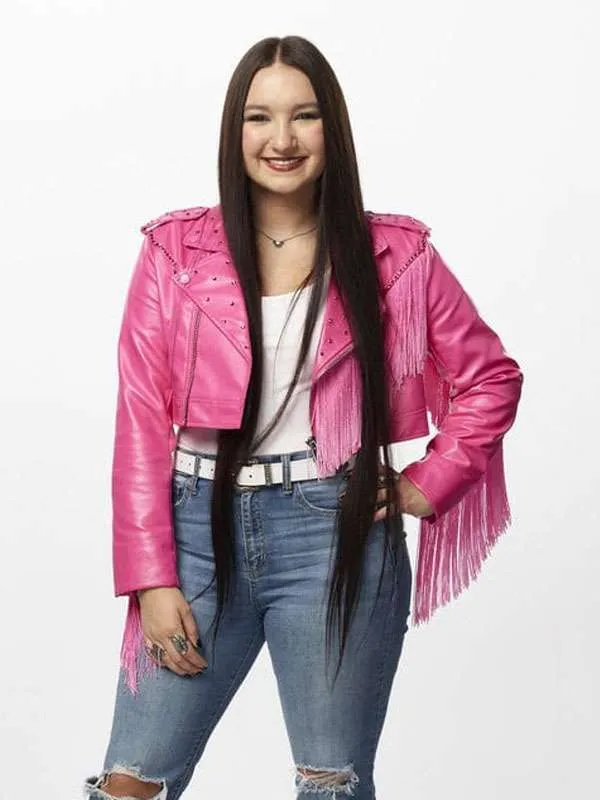 The Voice Season 27 Hailey Wright Pink Fringe Cropped Leather Jacket