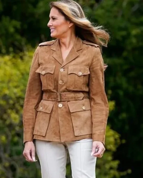 The Melania Trump Brown Suede Belted Jacket is a pleasant-looking and attractive jacket that can give any outfit a hint of sophistication. The creation emphasises its smooth surface that gives the jacket an elegant and sleek appearance. Its soft texture makes it easy to wear, and at the same time, it looks good. The belted design is an added look that gives the overall appearance a flattering fit. It has fine detailing with a vintage brown shade that gives it a strong and assertive impression. This jacket combines both fashion and comfort, which portray a classic look in a plain manner.