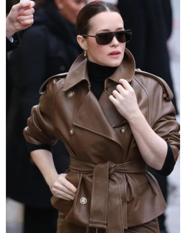 Paris Fashion Week 2026 Claire Foy Brown Leather Trench Jacket